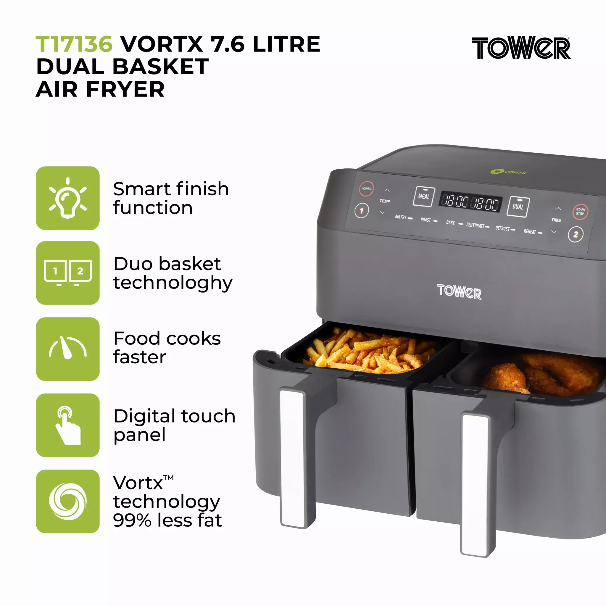 ÂCook more of the food you love with the Tower 7.6L Dual Basket Vortx Air Fryer. Two large 3.8L baskets cook twice as much food than a standard air fryer, so you can whip up deliciously healthy meals for all the family with minimal effort. Little to no oil is required, all while keeping the same great taste, so you lose the fat not the flavour, whilst rapid air circulation creates crispier textures across your mealtime favourites – 30% faster than a conventional oven. Get more from your air fryer using the smart finish function. Simply set to cook different foods in each basket – both ready to enjoy at the same time, to feed the whole family together. Its digital touch panel features easy-to-use controls with air fry, roast, bake, dehydrate, defrost and reheat functions to cook your air fryer favourites at the touch of a button, with individual controls over each compartment to cook different foods at different temperatures.