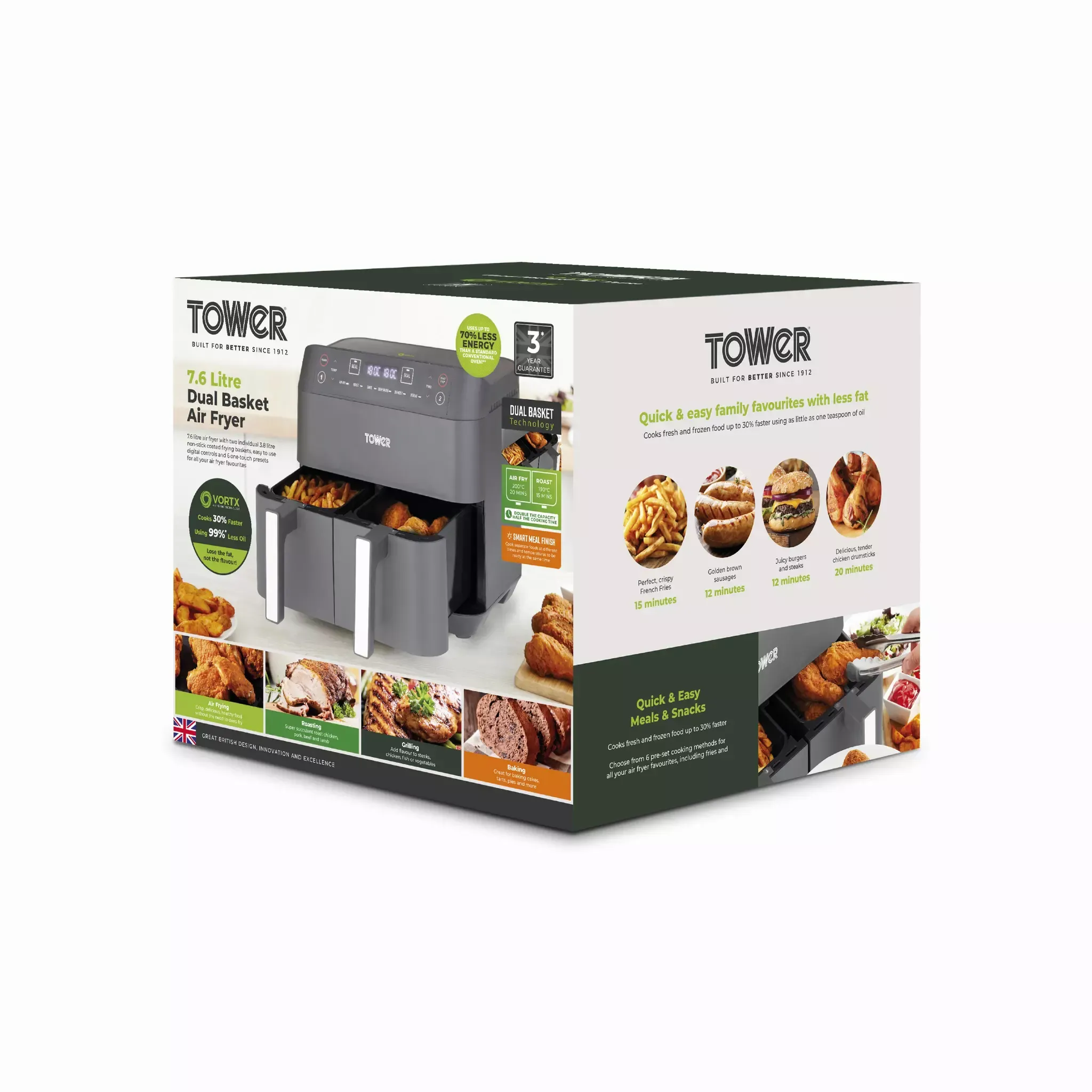 ÂCook more of the food you love with the Tower 7.6L Dual Basket Vortx Air Fryer. Two large 3.8L baskets cook twice as much food than a standard air fryer, so you can whip up deliciously healthy meals for all the family with minimal effort.