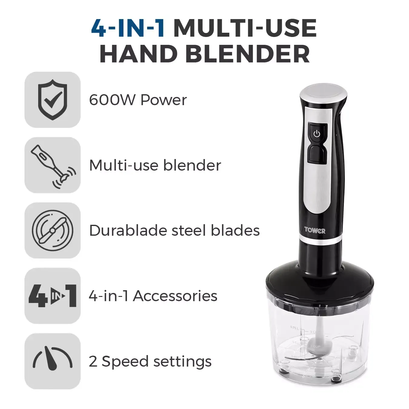 4-in-1 Multi-Use Hand Blender with Stainless Steel Blades, 600W