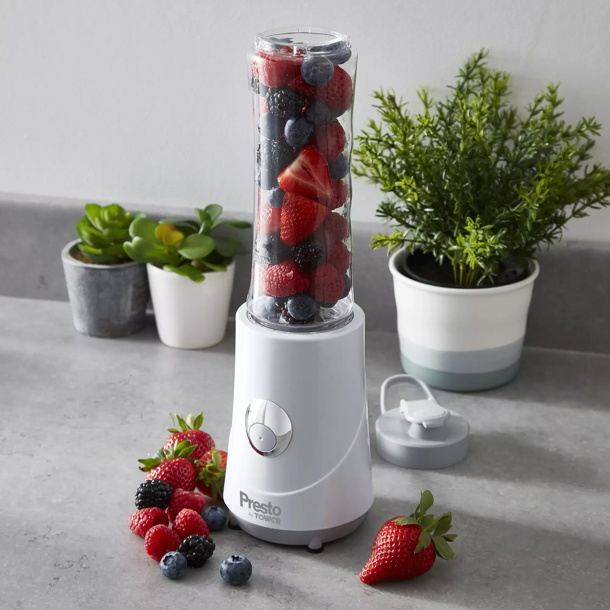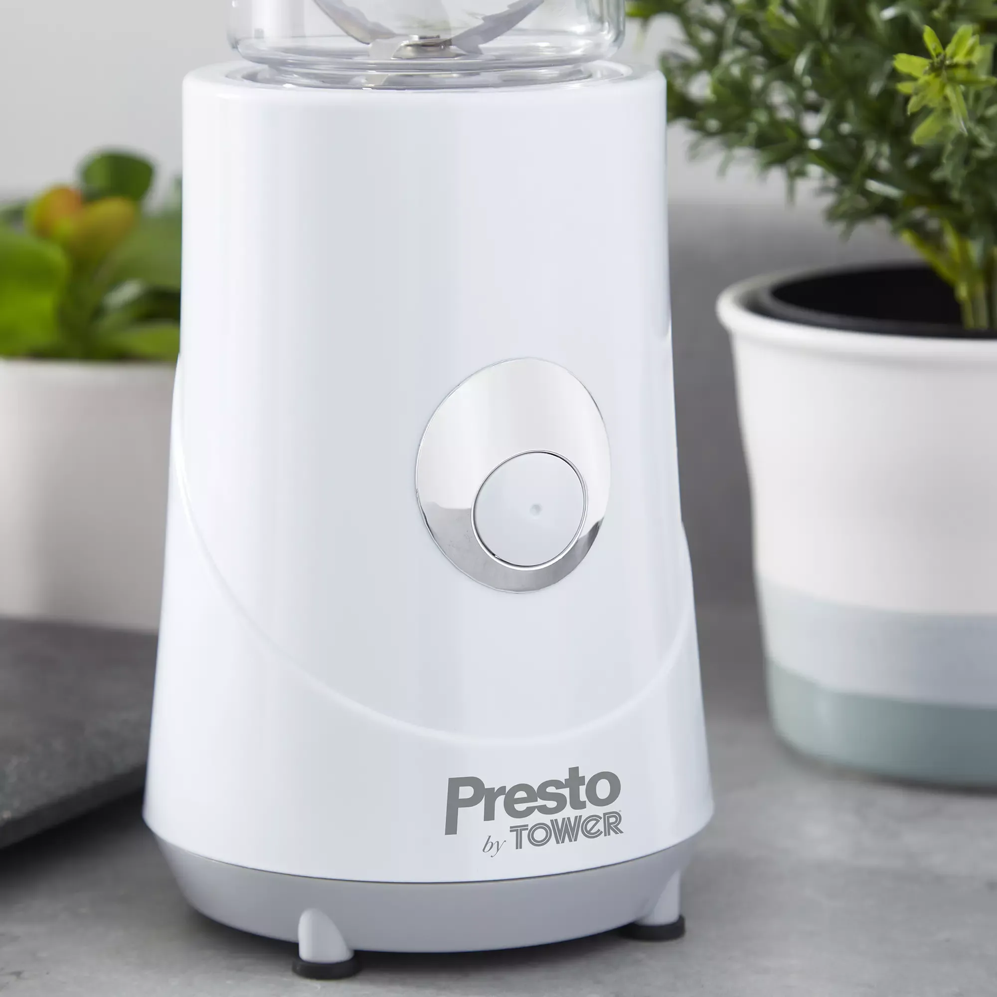 Create perfectly blended textures with ease using the presto personal blender. Housing a 260W motor and a durable stainless steel cutting blade, you can effortlessly blend through fruits and vegetables to create delicious soups, smoothies and dips. With a simple one touch switch to begin operation, you can easily attach the included sports bottle, ideal for taking your smoothies on the go to work or the gym. The locking mechanism activates during blending for safe and secure operation.