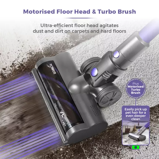 Ultra-efficient motorised floor head agitates dust and dirt leaving carpets and hard floors clean and freshÂ