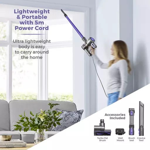 Ultra lightweight 1.3kg body is easy to carry and move from room to room, for cleaning up high or down low anywhere in the home with the 5m power cord providing maximum reach