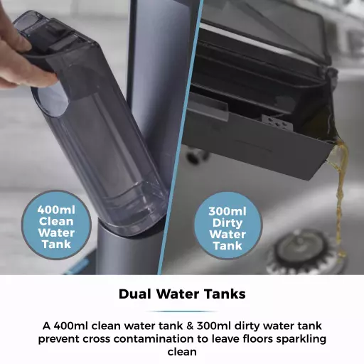 Includes a 0.3 litre clean water tank and 0.4 litre dirty water tank to separate clean and dirty water, so there is no cross contamination to leave tiled, laminate and hard floors in pristine condition