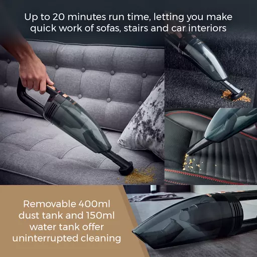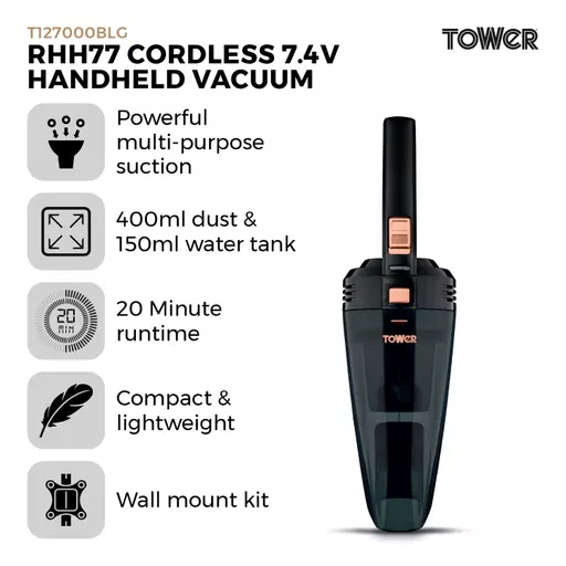 ÂPacked full of power and functionality, this Tower cordless handheld vacuum cleaner is everything you need for a quick clean. Its high-powered motor efficiently cleans small, confined spaces around your home and even car interiors. The strong suction effortlessly absorbs wet and dry spillages such as dust, food crumbs, milk and a range of other spilled liquids for quick and easy cleaning. Providing a large 400ml dust and 150ml water capacity, you can experience uninterrupted cleaning without having to constantly empty the compartments, along with a 40 minute runtime to seamlessly clean at any mess or spills. Tanks to a lightweight and compact design you can clean everywhere from upholstery, furniture and the car interior without strain. The vacuum comes complete with a crevice nozzle, round brush and wet rubber nozzle to collect dirt and liquids for a deep, penetrative clean. A wall mount kit allows you to store the vacuum where you need it most, with a DC for regular charging between uses.