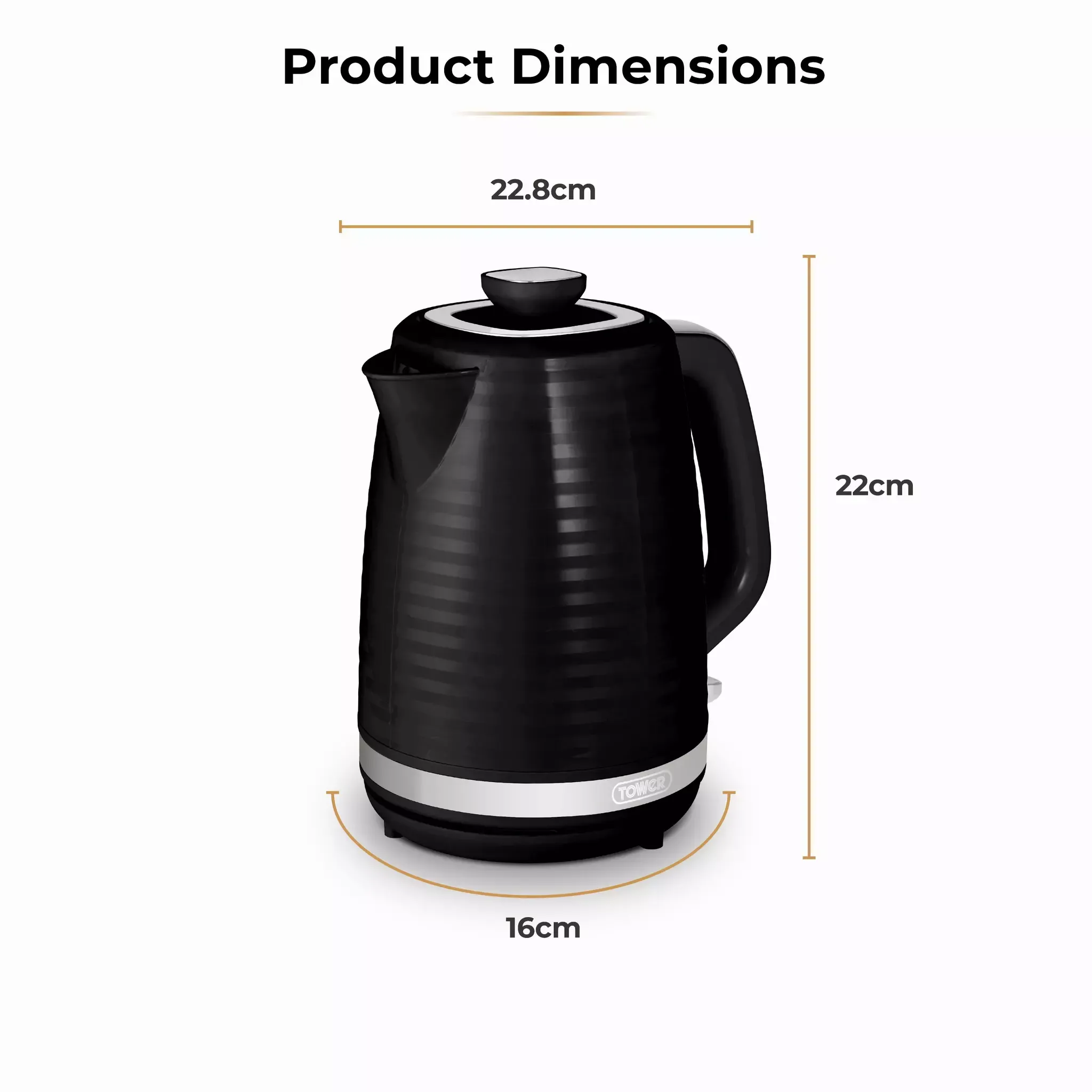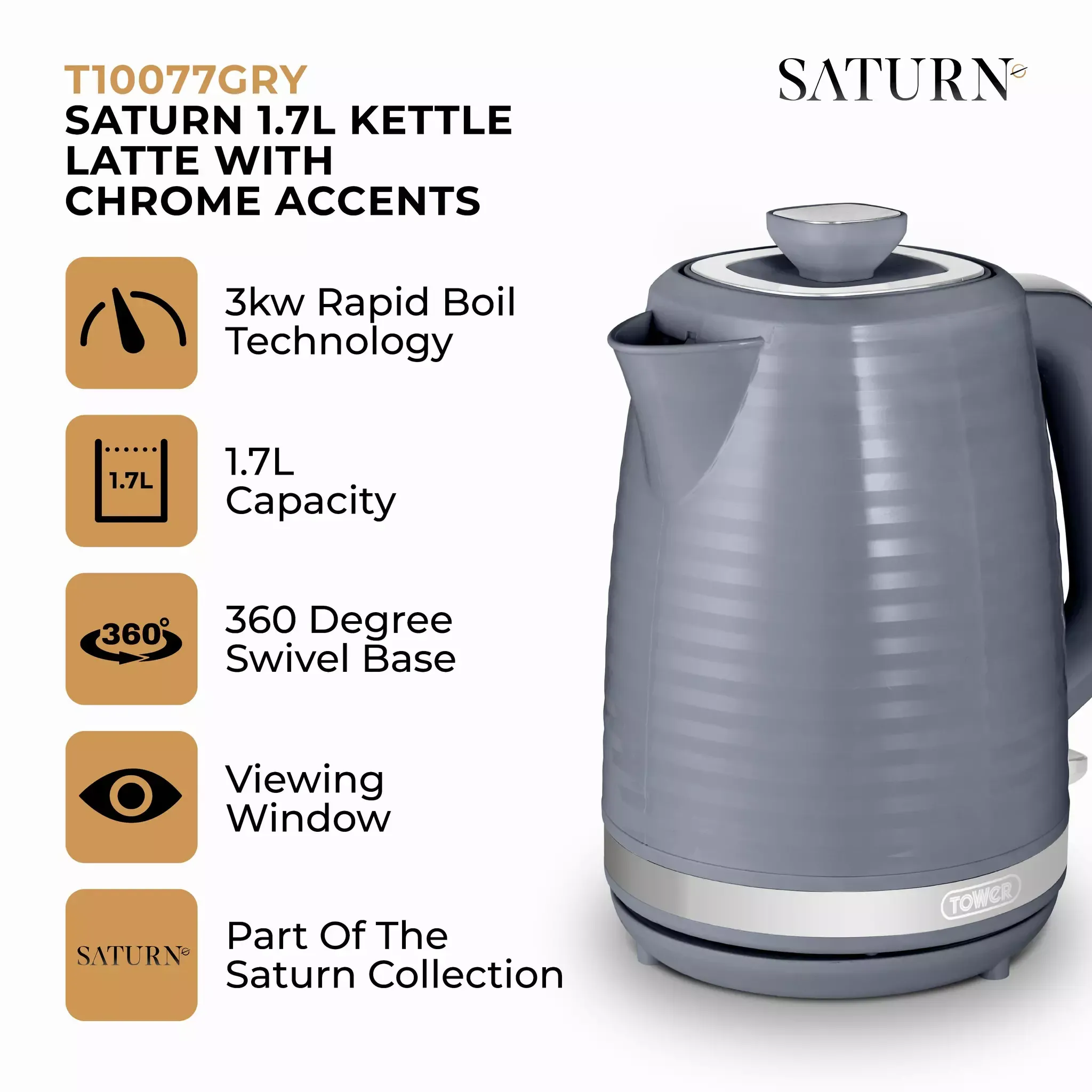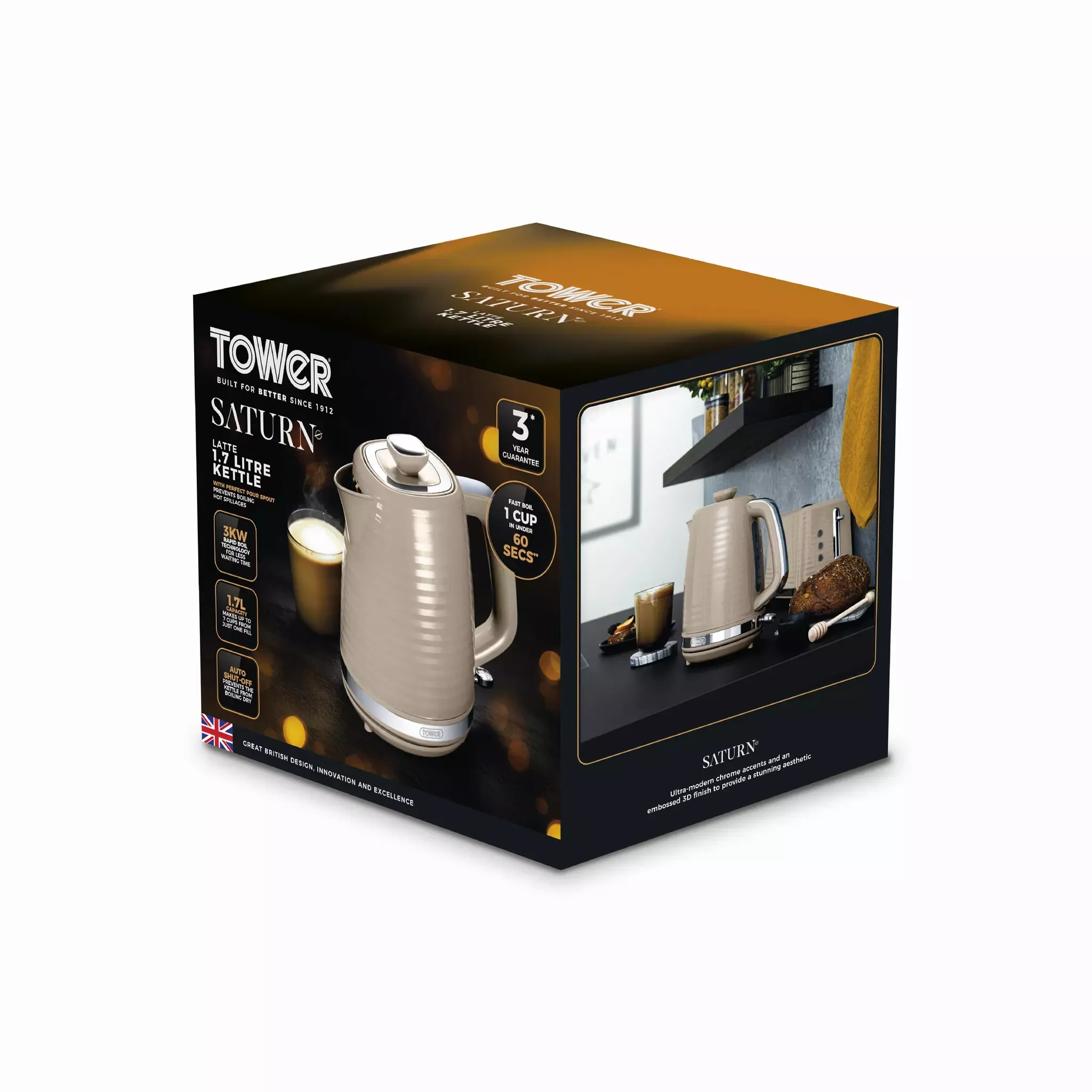 ÂAdd a contemporary touch to your kitchen with this Saturn kettle from Tower. It comes with ultra-modern chrome accents and an embossed 3D finish to provide a stunning aesthetic. Its large 1.7L capacity with quick boil function lets you make up to 7 cups in less than a minute.