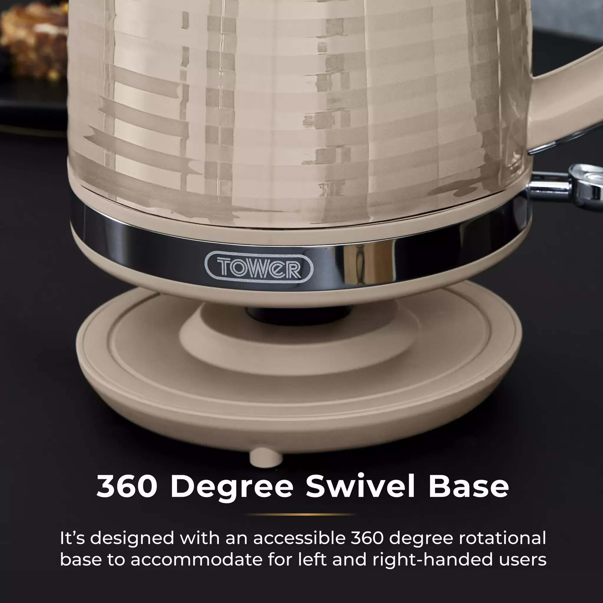 ÂAdd a contemporary touch to your kitchen with this Saturn kettle from Tower. It comes with ultra-modern chrome accents and an embossed 3D finish to provide a stunning aesthetic. Its large 1.7L capacity with quick boil function lets you make up to 7 cups in less than a minute. Designed with busy mornings in mind, this kettle is packed with a range of practical features to take the hassle out of drink making. It has quick boil functionality to boil the perfect morning brew in under a minute, while the large 1.7 litre capacity lets you make more drinks in less time. Dual viewing windows allow you to easily monitor the water level and measure the exact amount you need. A pull up removable lid prevents any obstructions getting in your way as you refill, while the 360 degree swivel base makes the kettle more accessible and comfortable to use for both left and right-handed users.
