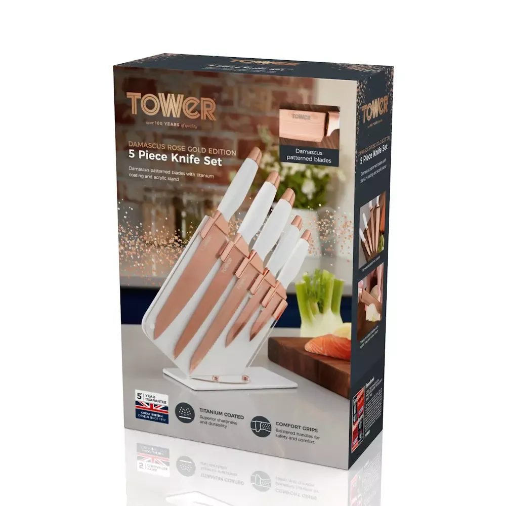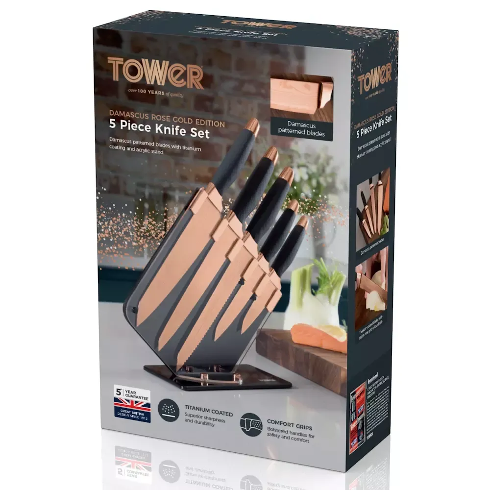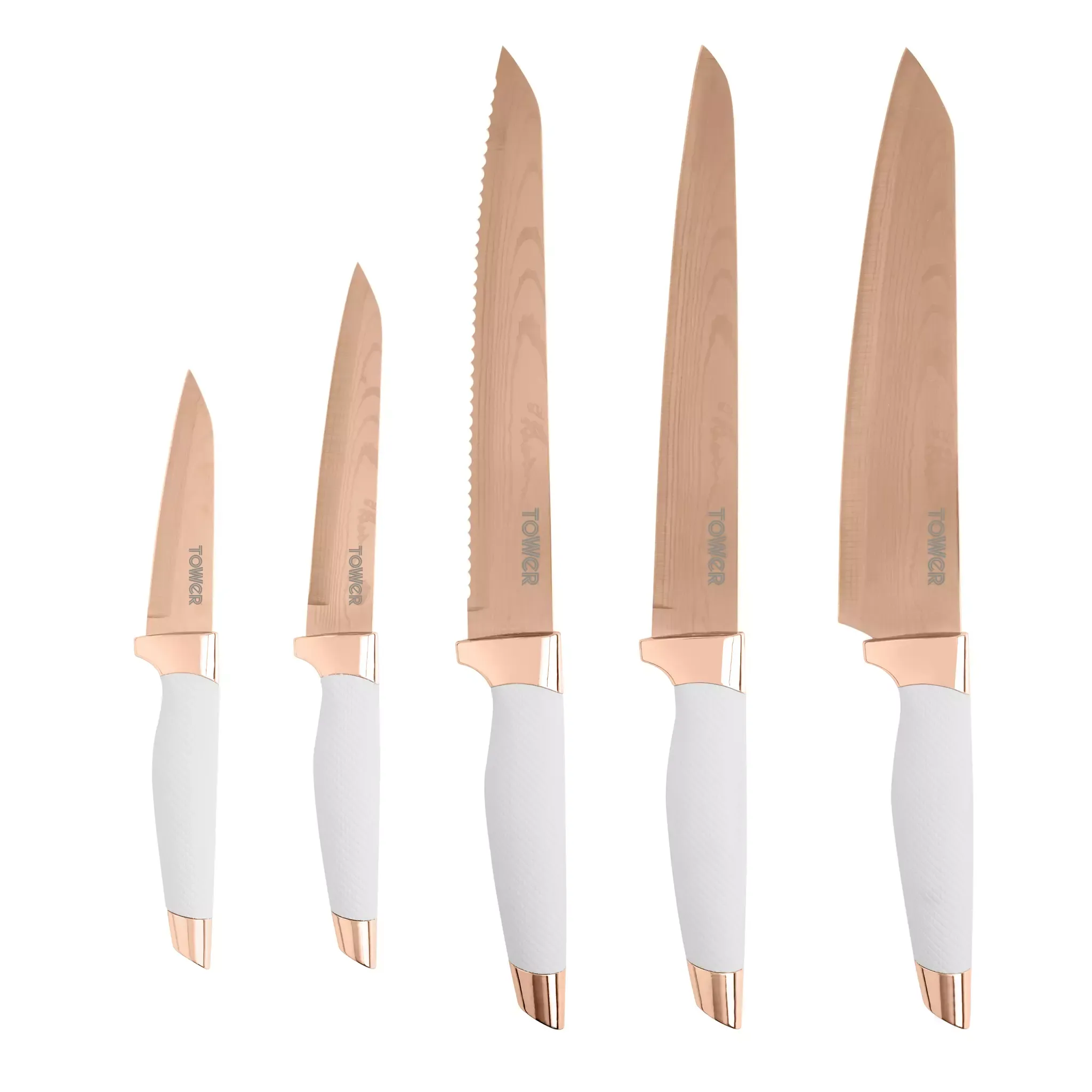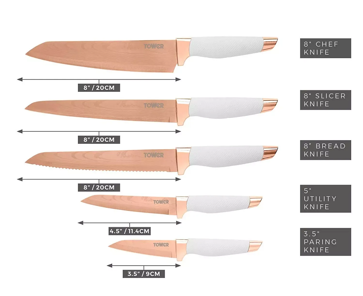 Equip your kitchen with this stunning 5 Piece Knife Set from Tower. Including a 8Â inch chef knife, 8Â inch slicing knife, 8 inch bread knife, 5Â inch utility knife and a 3.5Â inch paring knife, you will be able to meet all kinds of food preparation demands with ease. The high-grade stainless steel blades coated in titanium are extremely durable, providing long-lasting use with a sublime performance every time.