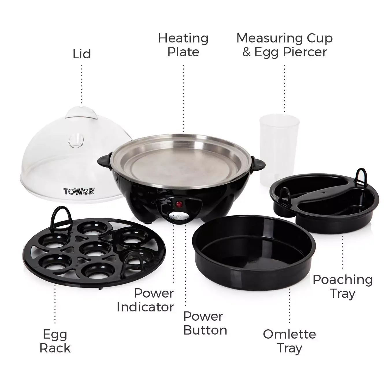 Cook up a variety of delicious meals with the Tower 360W Multi-Function Egg Cooker. It cooks up to 7 perfectly soft (6½ mins), medium (9 mins) or hard boiled eggs (13 mins) and creates 4 perfectly poached eggs, 2 fluffy omelettes and classic scrambled eggs for the whole family. Its parts are dishwasher safe for a quick and easy clean after cooking. The indicator light and signalling beep lets you know when your eggs are ready, so that they’re always cooked just how you like them, with auto shut-off for perfect cooking. Includes egg stand, poaching tray, omelette tray, 2-in-1 measuring cup and egg piercer to create many different meals with ease.