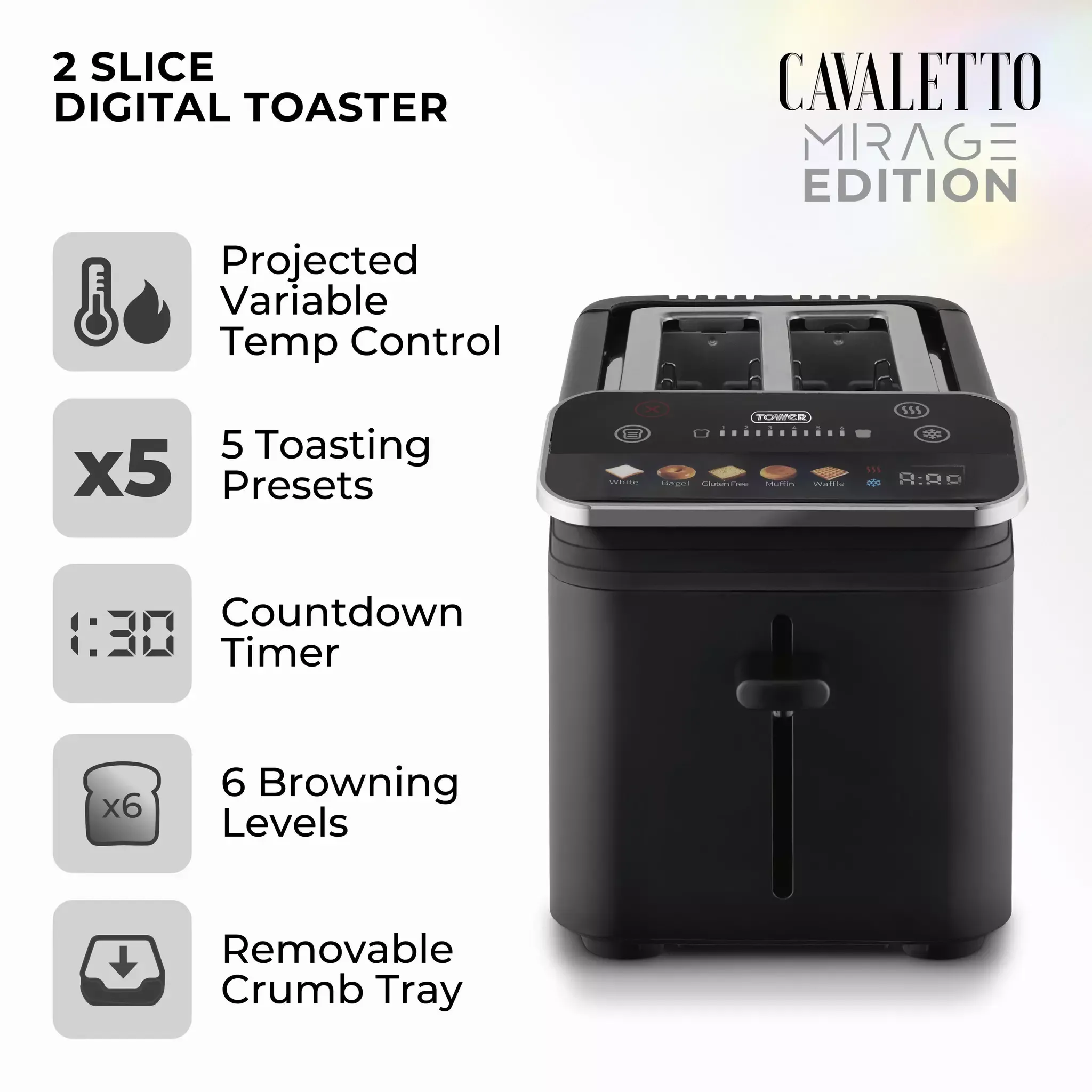Make breakfast times fuss free with this 2-slice Digital Toaster from Tower’s Mirage Collection. The Digital Control Panel will let you select cooking options and browning settings with simple one touch controls. Cook your favourite toasted items in both slots with ease, with 5 preset toasting options to choose from for convenience. A removable crumb tray makes it easy to dispose of excess crumbs to keep the worktop clean, with integrated cord storage to keep your surface neat and free from wires. Non-slip feet will keep the toaster secure on the worktop for additional safety. Defrost, reheat and cancel options offer versatile cooking whilst the automatic pop-up function ensures your toast, crumpet or bagel can be easily lifted from the toaster once cooking has finished. Stainless steel housing retains heat and offers durability and a sleek black finish combined with a chrome trim that creates a timeless look.