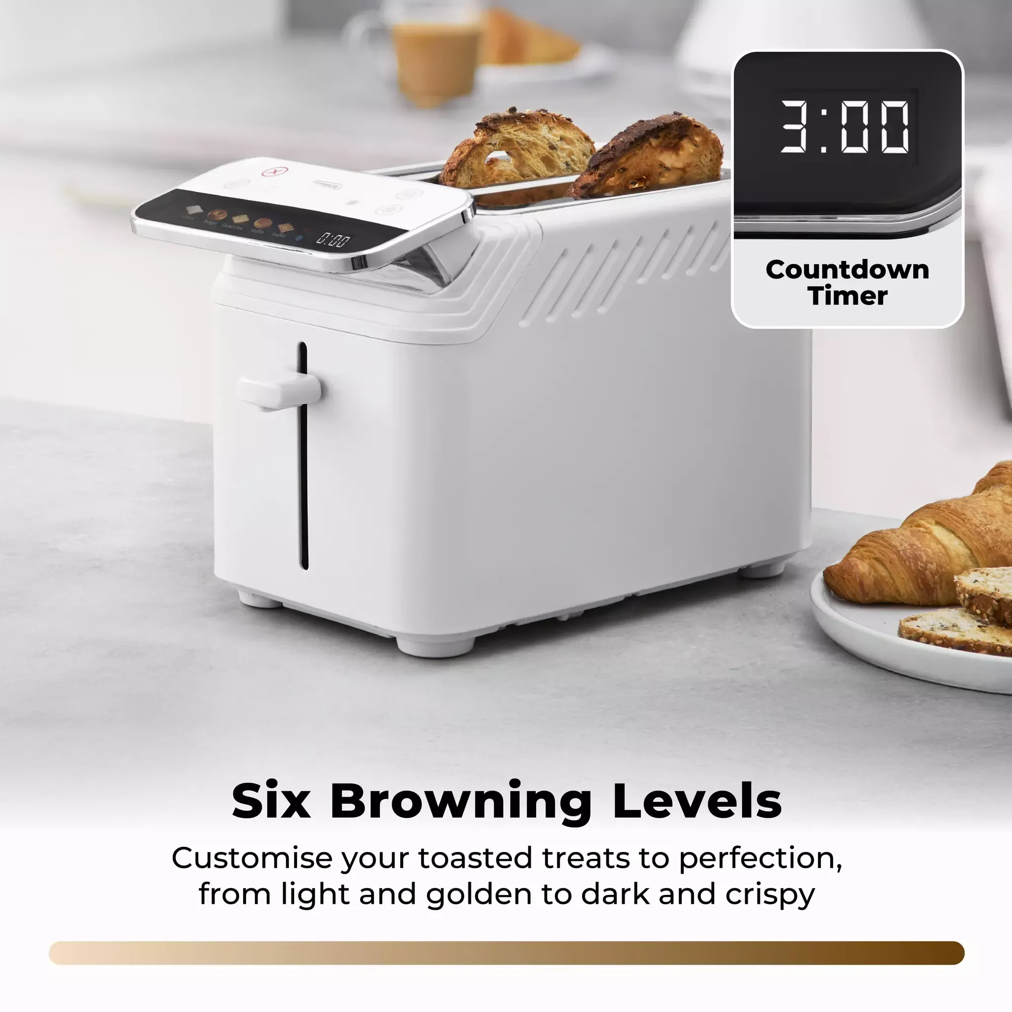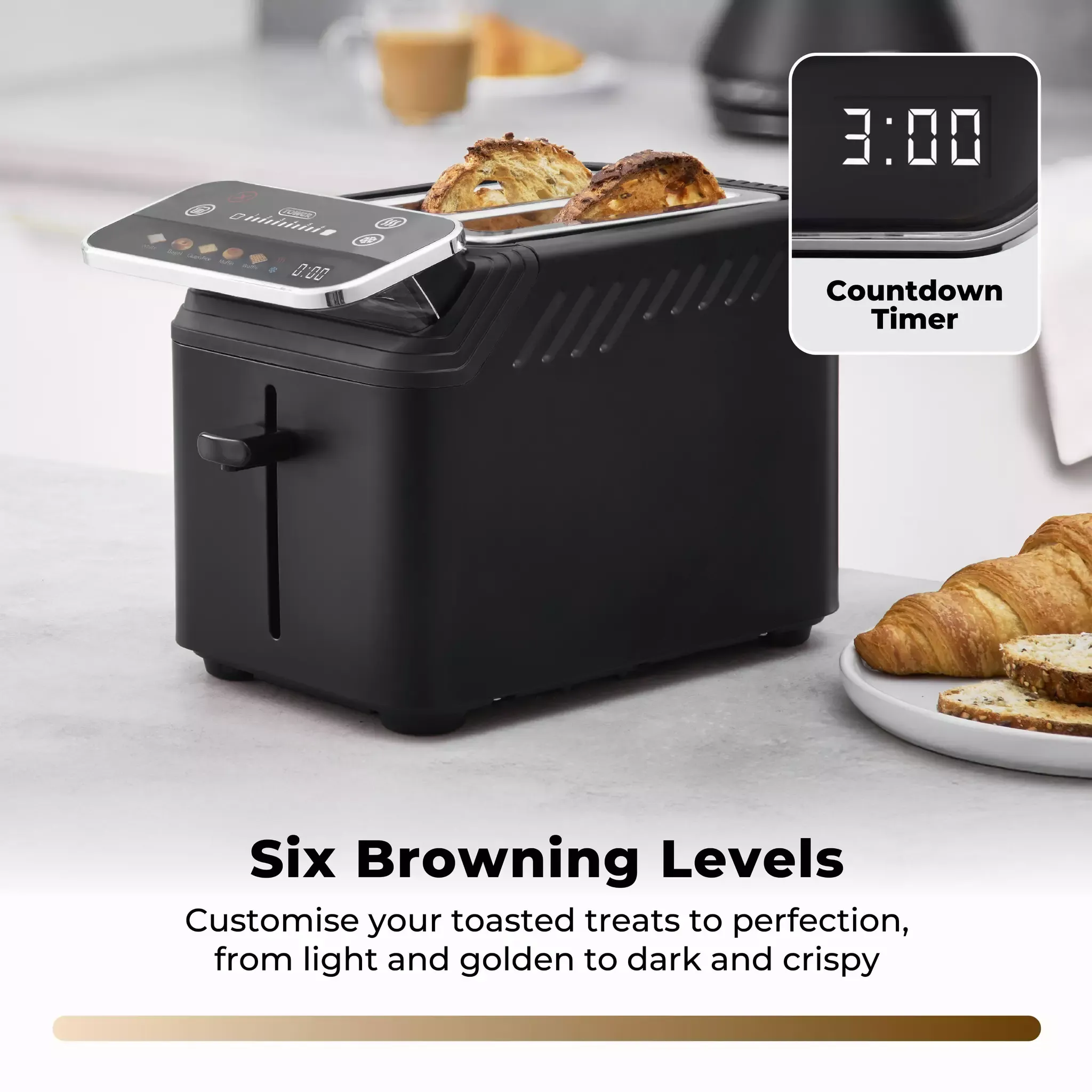 Clearly displays remaining cooking time on the control panel to take the guesswork out of making toast, crumpets and other toasted treats