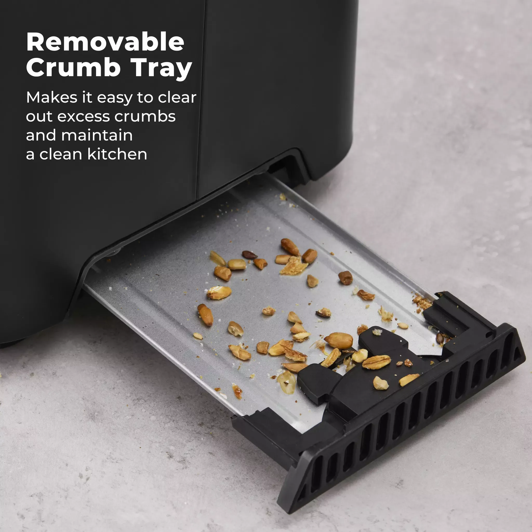 The pop-out removable crumb tray makes it easy to clear out excess crumbs and maintain a clean kitchen